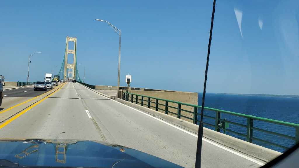 We officially hit the road Monday at 9 AM ET – yep, later than planned. Turns out, there’s always one more thing to do or pack. We rolled up I-75 and crossed into the Upper Peninsula on the Mighty Mac under a sky of pure blue. Luckily, the wind was not too much for the truck/trailer combo on the bridge.